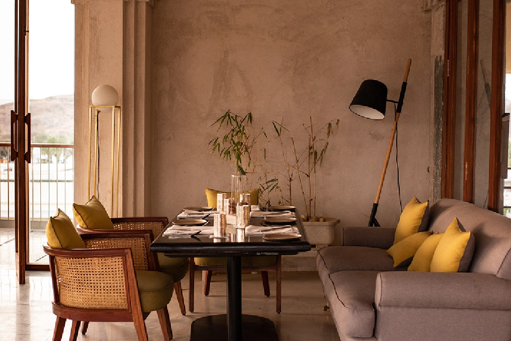 Enjoy panoramic views of the countryside and the Aravali hills with a seasonal menu featuring dishes made from home-grown ingredients, handpicked from the chef’s garden. The restaurant’s clean, minimalist design is complemented by original wall paintings of Devigarh’s former rulers and historic photographs of the palace.