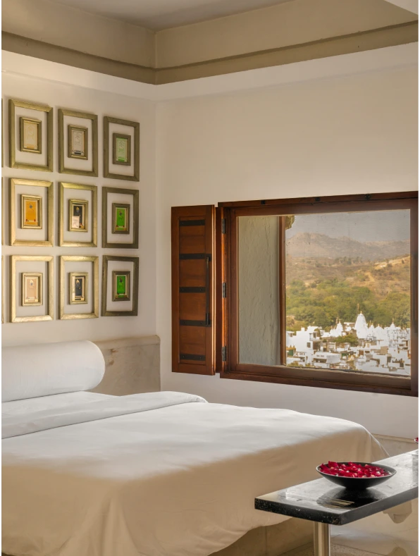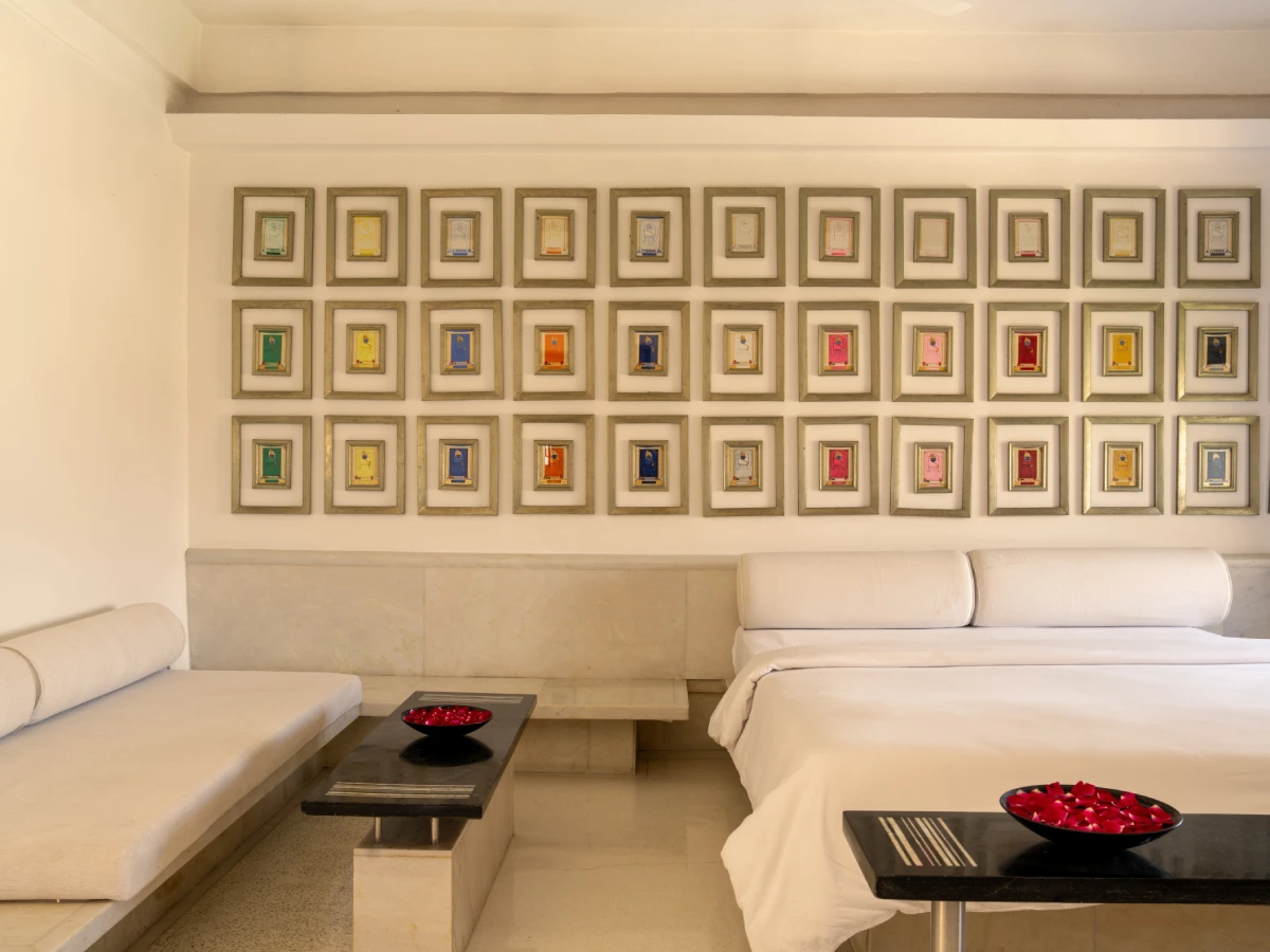 The Aravali Suite offers guests a stay in the historic Rajput palace, which is both grand and authentic. Featuring privacy and spaciousness, the suite’s design incorporates traditional motifs carved across the walls and flooring. Equally striking are the views on both sides: one overlooking the Aravali hills and the other showcasing the hotel’s interiors, including the black marble Kamal Courtyard with a lotus image, the Durbar Courtyard, and the Janana Courtyard.